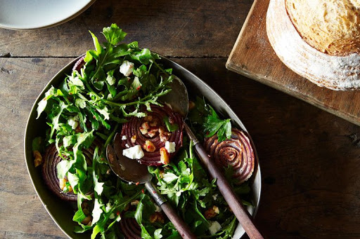 Roasted Onion Salad with Arugula and Walnut Salsa