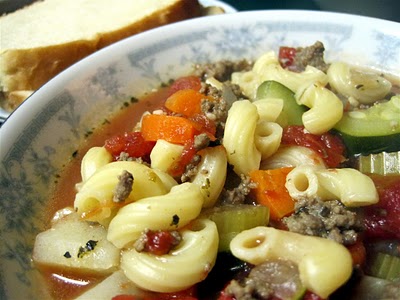 In a large stockpot or Dutch oven, cook the meat, onion, and garlic over medium heat until meat is no longer pink; drain. Add the water, tomatoes, potatoes, carrots, celery, bullion cubes, Italian seasoning, and salt; bring to a boil. Reduce heat and simmer until vegetables are just tender. Add zucchini and macaroni; simmer for additional 15 minutes or until tender.