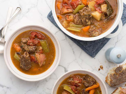 Remove pot from the oven. Skim the fat from the cooking liquid with a spoon or ladle. Add the potatoes, carrots, celery, and the tomatoes, and bring to a simmer on top of the stove. Cook, uncovered, stirring occasionally, until the liquid thickens and the vegetables are tender, about 1 hour. Remove and discard the herb bundle. Stir in the vinegar and season with salt and pepper, to taste. Divide among bowls and serve immediately.