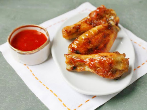 Meanwhile, stir the honey, soy sauce, curry powder, cumin and hot sauce together in a large bowl. Toss the chicken wings to coat, and then return to 1 of the pans and continue to bake until glazed and charred in places, about 5 minutes. Serve with a small bowl of sweet chili sauce, for dipping.