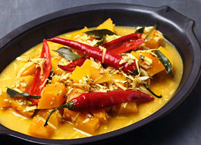 3In a small, nonstick frying pan, heat the oil until hot and add the mustard seeds, curry leaves, and red chiles. Stir and cook over high heat for 1-2 minutes, then pour this mixture over the pumpkin curry. Season and serve.