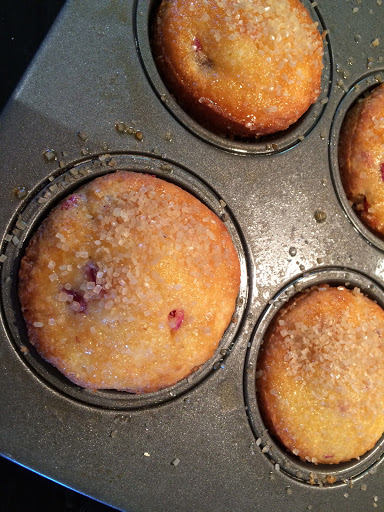 Stir together 2 1/2 cups flour and next 3 ingredients; add to butter mixture alternately with milk, beginning and ending with flour mixture. Toss cranberries with 1 tbsp flour. Fold cranberries into batter. Divide batter evenly between 2 (12-cup) muffin pans coated with cooking spray.