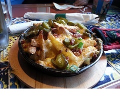Add a thick layer of cheese and jalapenos and crumble the bacon on top of the fries.