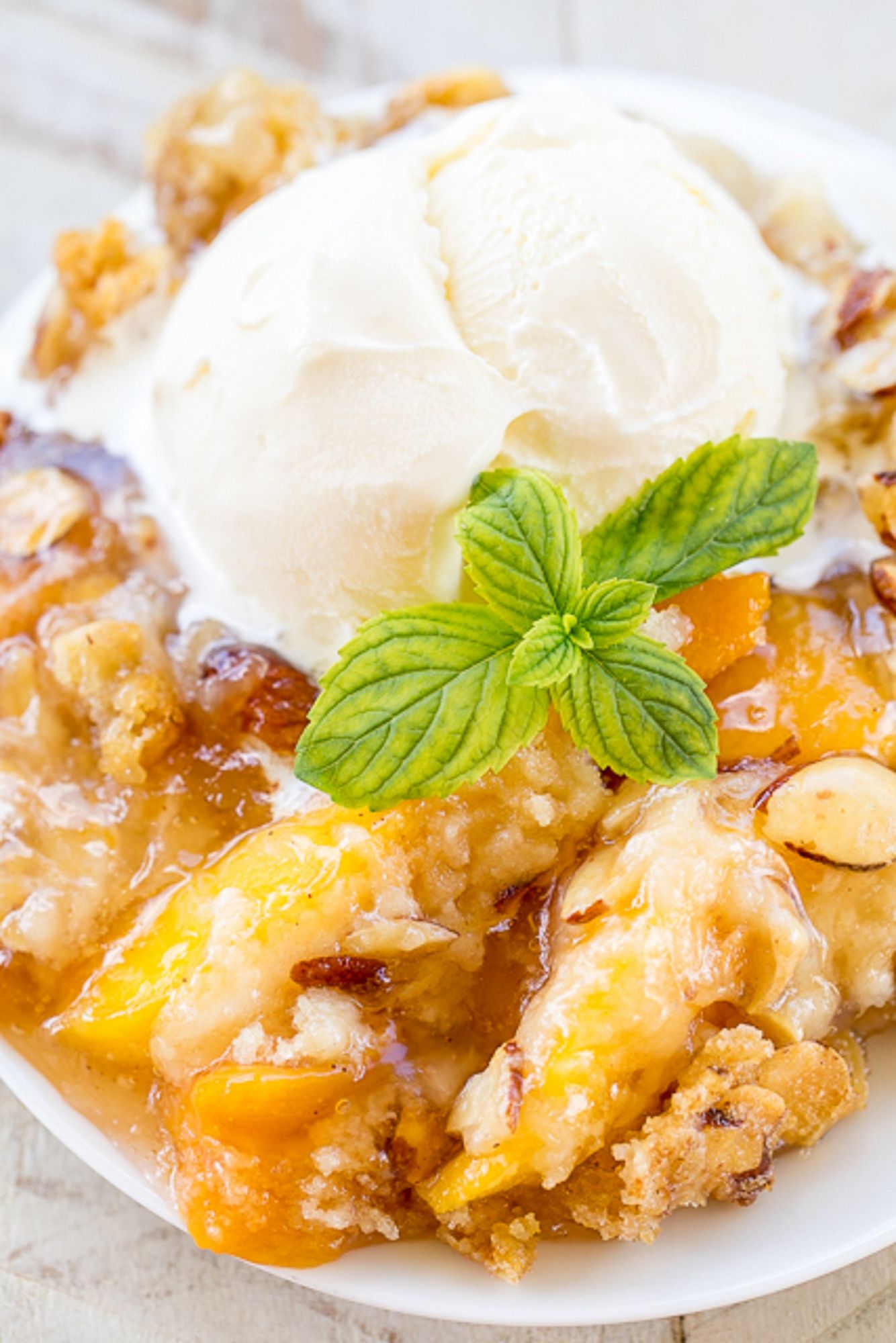 Top peaches with dry cookie mix and almonds. Pour melted butter evenly over top of cobbler.
