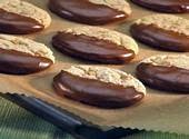 5. Dip about 1/3 of each cookie into melted chocolate. Shake gently and scrape cookie bottom on edge of bowl to remove excess chocolate. Place on prepared tray. Refrigerate until chocolate is firm, about 30 minutes. Store in cool, dry place with wax paper between layers of cookies. About 4 dozen cookies.