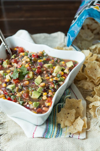 Mix everything, but the avocado and cilantro and let sit a few hours or overnight. Before serving add avocado and cilantro and serve with chips. It's delicious for eggs rancheros etc too!