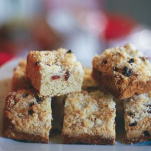 In a small bowl, combine the remaining 1/2 cup sugar, 3 Tbs. flour and 2 Tbs. cold butter. Using your fingertips, work the ingredients together to make a coarse crumble. Sprinkle the dried fruits over the batter and then sprinkle with the crumble mixture.