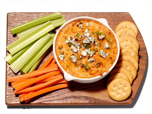 Mix 4 ounces softened cream cheese and 1/2 cup each sour cream and Frank's RedHot sauce (or 1/4 cup other hot sauce); fold in 2 cups shredded rotisserie chicken. Spread in a small baking dish, sprinkle with celery seeds, chopped scallions and shredded cheddar and bake at 425 degrees F until bubbly, about 20 minutes. Top with crumbled blue cheese. Serve with celery and carrot sticks and crackers.