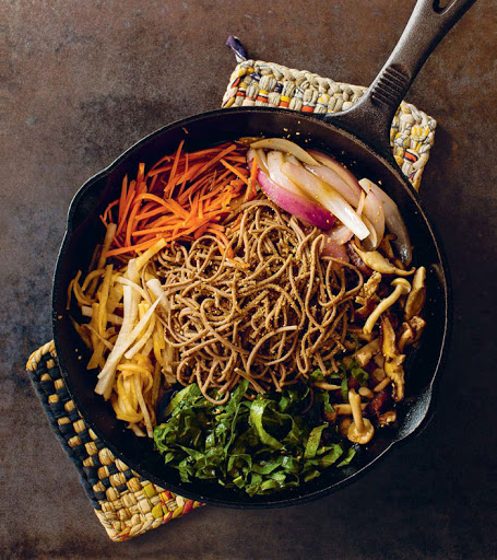 that they don’t stick but stay roughly in their defined area. Add water and simmer vegetables until collards are wilted (about 1 minute longer). Push ingredients closer to edge of pan and transfer cooked noodles to center of skillet. Reheat shiitake-kombu stock and pour over noodles and vegetables.