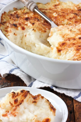 Transfer the potato mixture to a medium gratin or baking dish (approximately 2 1/2 quart). Bake for 30 minutes, or until warmed through. Sprinkle with Parmesan cheese and finish under the broiler until golden, about 2 minutes.