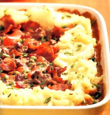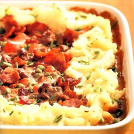 4 Prepare mashed potatoes as directed on package using hot water, milk and butter. Spoon or pipe around edge of hot beef mixture. Sprinkle with reserved bacon.