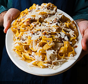 6. Add 1½ cups of the stock and ½ cup of the milk and reduce by half, 12 to 15 minutes. Add the Parmesan rinds, nutmeg and remaining stock and milk, skimming any fat that rises to the surface, and continue cooking until the flavors have come together and the sauce has become very thick, 35 to 45 minutes. Season with salt and allow to cool. Remove and discard the bouquet garni. Make ahead: The sauce can be made up to 3 days ahead. Cover and chill. Toss with tagliatelle or the pasta of your choice and top with fresh-grated Parmigiano-Reggiano before serving.
