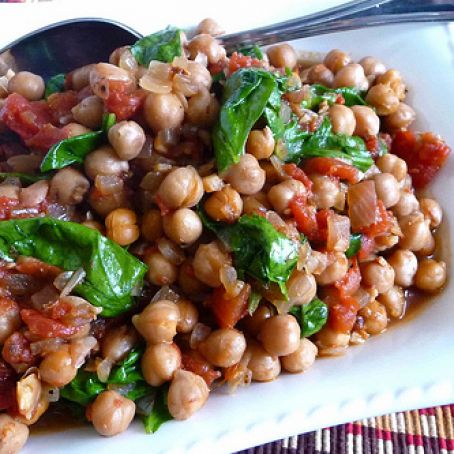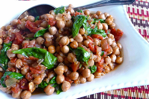 Spread the chickpeas in the bottom of a crockpot (slow cooker). Pour the tomato mixture over the chickpeas and stir well.