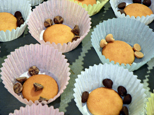 PREHEAT oven to 350° F. Place 36 2-inch foil bake cups on baking sheet(s) with sides. Place one vanilla wafer, flat-side down, on bottom of each cup. Place 5 to 6 morsels on top of each wafer.