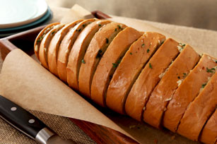 CUT bread into 3/4-inch-thick slices, being carefully not to cut all the way through to bottom of loaf. Spread 1 side of each bread slice with cheese mixture. Wrap in foil.