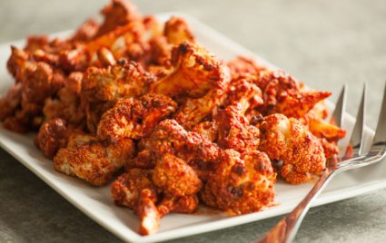 Meanwhile, whisk vinegar, sweet paprika, garlic powder, smoked paprika, cayenne, salt and 3 tablespoons water together in a large bowl. Taste the sauce; if you’d like it hotter, add a bit more cayenne. Toss the cauliflower in the sauce until well coated and transfer to a platter.