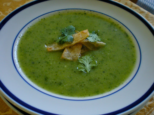 Working in batches, pout the onion-milk mixture into a blender, add the cilantro, and process until smooth. Pour the puree into a large saucepan and place over medium heat. Gradually stir in the stock, pepper, and salt and cook, stirring occasionally, for 10 minutes. Stir in the crema and simmer only until heated through.