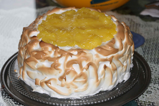 4. Spread meringue around sides of cake and aroung outer edge of top layer.