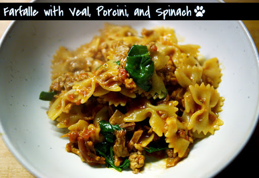 While your veal and porcini mixture is simmering, cook your pasta. Bring the water to a boil and add in a bit of salt. Cook the farfalle until 1 minute shy of the package directions. Drain the pasta, reserving a touch of water just in case.