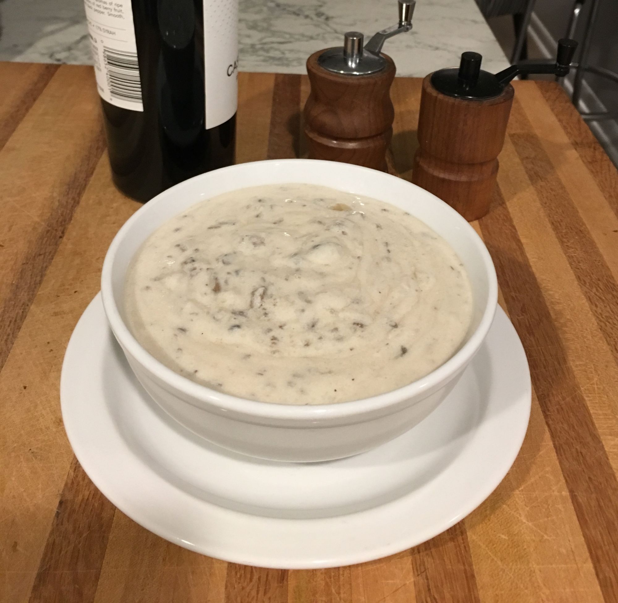 In a dutch oven, saute onions, garlic and mushrooms in butter. Cover your pot and simmer until mushrooms are cooked until tender and soft. Add 6 Tbsps of flour and mix thoroughly then add chicken broth slowly stirring constantly to prevent lumps. Stir until completely mixed and thickened slightly. Put additional 3 Tbsps of flour into half and half and whisk until smooth. Gradually add to pot and stir constantly until slightly thickened. Serve.