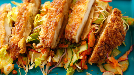 * Season the chicken with salt and white pepper. Dredge the chicken in a little flour, then coat in the eggs and then in panko.