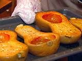 Place butternut squash halves on a large baking sheet flesh side up. Place 1 teaspoon butter in the middle of each squash. Sprinkle brown sugar over each squash. Season with salt and black pepper. Roast 25 minutes, until flesh is fork-tender. Reserve 2 halves for future meal.