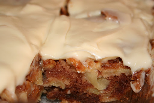 Who can resist a fresh apple cake with cream cheese frosting!? This cake is delicious! The oil in the cake makes the batter moist, yet crisp around the apples edges so they are NOT SOGGY! No one likes a cake or even a muffin that has baked fruit that is soggy.