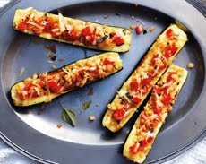 Spoon mixture evenly into zucchini halves and sprinkle cheese on top. Bake for 20 min., until cheese is bubbling and brown around the edges.