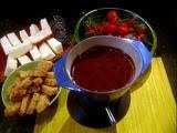 Take out of microwave and give it a quick whisk. Add wine and whisk again. Transfer to a fondue pot with a flame underneath. Serve with pound cake cubes, strawberries, and biscotti bits on the side, for dipping.