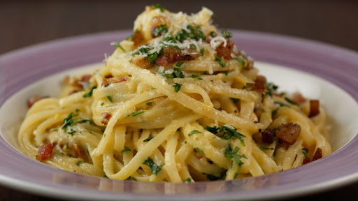 Add 1 full cup of starchy cooking water to egg yolks in a slow stream to temper them. Reserve an extra half-cup starchy water in case the pasta gets too tight when you toss it. Drain pasta and add to pancetta and garlic, remove from heat and toss with egg yolks and handfuls of grated cheeses, parsley, adjust salt and pepper to taste.