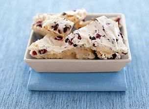 2. Beat egg whites and cream of tartar in large bowl with electric mixer on medium speed 5 minutes or until soft peaks form. Gradually add granulated sugar, beating on high speed until well blended. Add powdered sugar, 1 Tbsp. at a time, beating well after each addition. (Meringue will begin to turn glossy.) Continue beating until stiff peaks form. Stir in cranberries and chocolate. Spread onto prepared baking sheet to within 1/2 inch of edges of baking sheet.