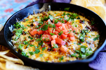 Remove from the oven, top with the diced tomatoes, sprinkle on the tomatoes, and serve immediately with tortilla chips!