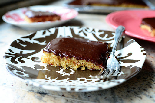 Pour the icing over the warm cake right out of the oven and smooth the surface. Allow to sit for 10 minutes before cutting into squares and serving warm.