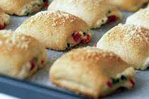 SEPARATE dough into 8 rectangles; seal seams. Spread with cream cheese mixture; top with peppers and parsley. Fold each rectangle lengthwise into thirds to enclose filling; cut into 4 squares. Place, seam-sides down, on baking sheet; top with remaining Parmesan.