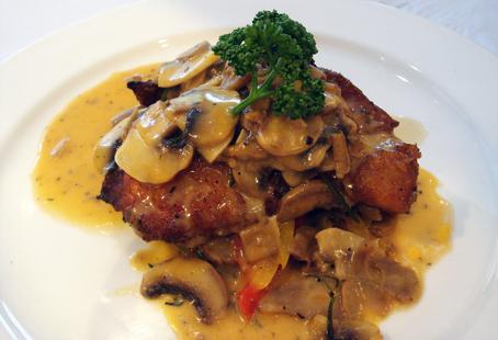 14. Add the cream to the roasting pan and bring sauce to a boil. Taste and adjust the seasoning. Spoon sauce over the chicken and garnish with the chopped parsley.