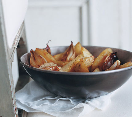 Shallots (but not potatoes) can be roasted (for 30 minutes only) 1 day ahead and chilled.