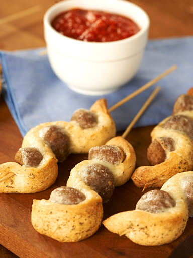 Unroll the dough and separate it into 12 breadsticks. Brush each breadstick with olive oil and then sprinkle on the Italian seasoning. Thread one end of a breadstick on a skewer. Then, skewer 1 meatball. Leave 1/4" between the dough and the meatball. Thread the breadstick and 2 additional meatballs on the skewer. Place the skewer on a nonstick cookie sheet and build the remaining "subs," placing each about a 1/2" apart. Bake for 10 minutes.