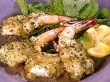 Brush a large oven proof skillet with some of the melted butter, coating the bottom well. Dip the shrimp in the butter, opened side down, and then dredge in the bread crumbs, pressing so they stick. Place the shrimp, bread crumb side up, in the skillet in 1 layer.