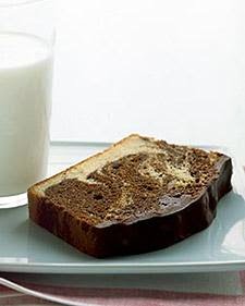 4. Pour half of batter into melted chocolate; stir well. Alternating between remaining plain batter and the chocolate batter, drop large spoonfuls of batter into the prepared pan. When pan is filled, use a table knife to cut through mixture with a swirling motion.