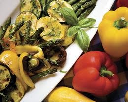Heat gas grill to medium high. Toss zucchini and squash with olive oil, and salt and pepper to taste. Grill with lid down for two minutes and open for one minute. Remove. Follow the same process for the peppers and mushrooms. Brush asparagus with olive oil and sprinkle with salt and pepper. Grill with lid down two minutes and one minute with lid up. Remove. Arrange all vegetables on serving platter and drizzle with vinaigrette.