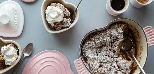 Remove bread mixture from the refrigerator and stir gently. Transfer the mixture to the Heart Cocotte. Bake for 55-65 minutes, or until bread is puffed and golden. Serve warm with a sprinkle of powdered sugar and a dollop of sweetened whipped cream.