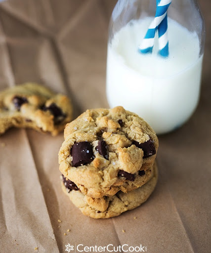 Line baking sheets with parchment paper. Use a heaping tablespoon of cookie dough for each cookie. Bake for 10 minutes, or until the edges of the cookies are just starting to brown. Immediately sprinkle the cookies with sea salt when they come out of the oven.