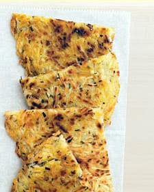 2. In a medium nonstick skillet, heat oil over medium. Add potato mixture; press with a heatproof spatula to flatten and form into one even pancake. Cook until underside is golden brown, 10 to 15 minutes. Slide pancake onto a plate; invert onto a second plate. Slide pancake (browned side up) back into skillet. Continue to cook until underside is golden brown, 10 to 15 minutes more. Slice into wedges before serving.