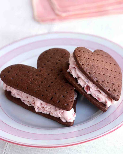 Strawberry ice cream sandwiched between two heart shaped, dense, fudgy chocolate cookies. A perfect Valentine's day or anytime treat.