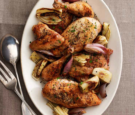 evenly. Shake off any excess flour. Place the chicken, fennel, shallots, and garlic in a