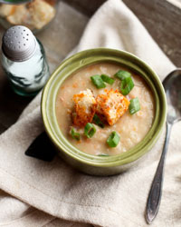 4. Return the soup to the pot and stir in the diced ham. Season the soup with salt and pepper and ladle into warmed shallow bowls.