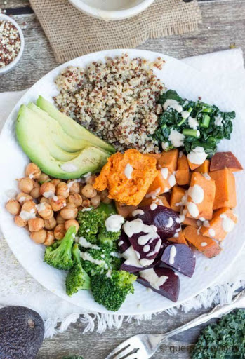 Transfer vegetables to a plate or large bowl and arrange as desired. Add quinoa, chickpeas, avocado and hummus to the plate.