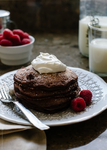 Using an ice cream scoop or ladle, pour pancake batter (about half a cup), 2 inches away from one other. Drop in a few chocolate chips into each pancake, and use a knife to gently push the chocolate chips into the batter and let a little batter cover the chocolate chips. When the pancakes are slightly dry around edges, about 2½ minutes, flip over. Cook for another minute.