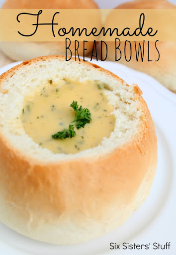 Using a stand mixer or large mixing bowl, add warm water and sprinkle in yeast. Let dissolve for a few minutes until yeast becomes foamy. Add melted butter, sugar and salt and mix until combined. Gradually add flour. Once combined, allow your mixer to knead the dough for about 5 minutes (you could do this by hand if you weren’t using a mixer, but it may get a little tiring!). Punch dough down and form into 6 equal sized balls. Place on a greased cookie sheet and let rise until doubled. Preheat oven to 425 degrees and bake for 20-25 minutes, or until golden brown. Let cool and cut off the top, remove some of the bread from the inside and fill with soup or dip.