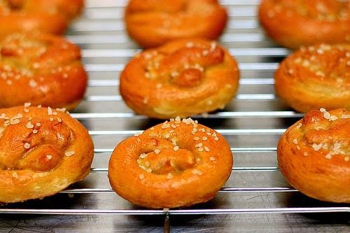 5. Roll one piece of dough at a time into an 18-inch-long strip. [I find the pretzels much easier to roll on an unfloured board, oddly enough, but see what works for you.] Twist into pretzel shape; transfer to prepared baking sheet. Cover with a kitchen towel. Continue to form pretzels; eight will fit on each sheet (you may need a third sheet if making miniatures). Let pretzels rest until they rise slightly, about 15 minutes.